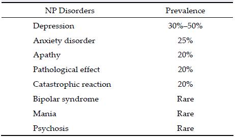 In the current study, we reviewed post-stroke NP disorders that potentially affected the rehabilitation of stroke survivors. First, we reviewed the prevalence of post-stroke NP disorders and then focused on the etiology and management of post-stroke depression (PSD) as well as the characteristics of and biological treatments for post-stroke apathy, catastrophic reaction, pathological effect, psychosis, and mania.