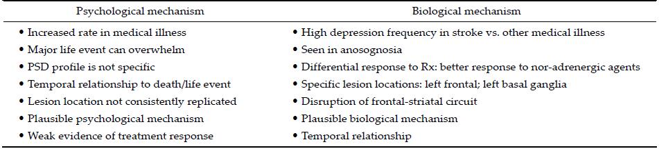 2.2 Etiopathogenesis of PSDThe development of PSD may be due to a proposed biological or psychological mechanism (Table 3). While the biological mechanism includes organic damage to parts of the brain (interruption of neural circuits and neurochemicals), the psychological mechanism includes poor coping skills, for example, a neurotic personality style[2,9-11] (Figure 1). Although each mechanism has its advantages, the etiopathogenesis of PSD is most likely a combination of both biological and psychological mechanisms.