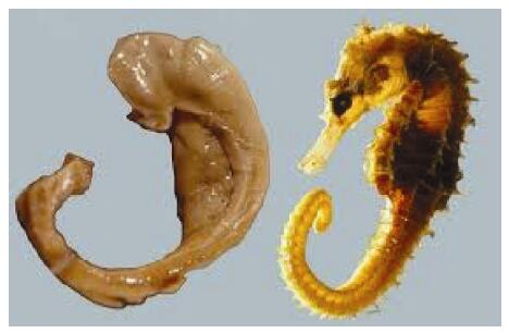 | Figure 1 Dissected hippocampus of human brain compared with a marine hippocampus (seahorse in Latin). It was prepared by László Seress in 1980. |