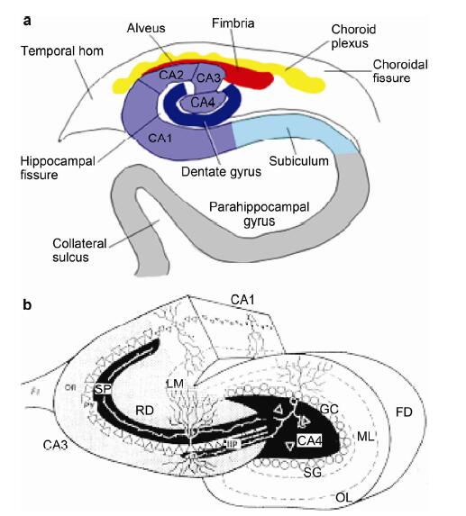 | Figure 6 he hippocampus proper seen in a relatively horizontal direction. In a,the CA4 is wrapped in the dentate gyrus. In fact,the hippocampus is a continuous structure. Different parts are twisted and interlocked together as seen in b. Some scientists consider CA4 part of the dentate gyrus and hence it may not appear in their publications. |