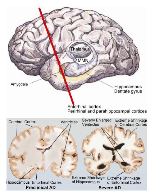 | Figure 7 Cross-sections through the entorhinal cortices. The left shows mild shrinkage of the entorhinal cortices whilst the right displays severe shrinkage (courtesy of UCSF Memory and Aging Center/http://memory.ucsf.edu/education/diseases/alzheimer) (MMN: mammillary nucleus). |