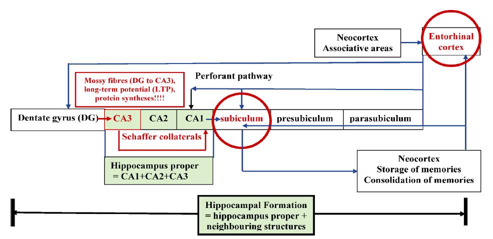 | Figure 8 Schematic summaries of structures of the hippocampal formation. Please note that there is only one entrance at the entorhinal cortex and one exit at the subiculum. They are both highlighted in a red circle. The proteins necessary for long-term memory are synthesized when passing through the mossy fibres. The projections jump from CA3 to CA1 via the Schaffer collaterals. |