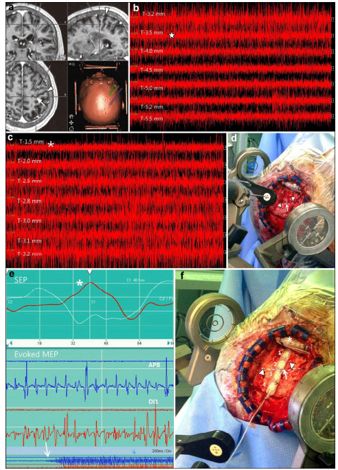 | Figure 1 Combined thalamic ventralis caudalis (Vc) deep brain stimulation (DBS) and motor cortex stimulation (MCS) in patient #4. a An image captured from the stereotactic planning software (Framelink®, Medtronic, Minneapolis, MN) during the determination of the initial target coordinates and trajectory planning for the Vc and the hand knob in the precentral gyrus. A white arrow indicates the location of the hand knob corresponding to the hand somatotopy of the precentral gyrus. An arrowhead indicates the central sulcus. b A typical microelectrode recording during exploration of the thalamic Vc nucleus. In the area T-3.5 mm, increased firing of the thalamic sensory nucleus is observed (star), which indicates entrance into the part of the Vc nucleus corresponding to a cutaneous core of the somatotopy. c A microelectrode recording shows an abrupt decrease in the firing of the Vc nucleus (asterisk). This means that the tip of the microelectroderecording probe is located below the thalamic Vc nucleus and is within the white matter. d An intraoperative photograph showing the localization of the precentral gyrus and the central sulcus. An asterisk denotes the implantation of the Vc DBS electrode before MCS. Arrow heads indicate the marking of the course of the central sulcus over the dura mater and an arrow indicates the location of the target for the precentral gyrus. e An image showing the phase reversal (asterisk) of the somatosensory evoked potential (SEP) in the upper image. The lower image shows a motor evoked potential (MEP) response taken from the abductor policis brevis (APB) and the first dorsal interossoeus muscles (DI1) through macrostimulation of the contacts of the paddle lead over the precentral gyrus. An arrow shows the elicitation of the MEP in the contralateral hand muscles. f An intraoperative photograph showing the placement of paddle lead for MCS. The contact "2" of the paddle lead is placed on the target for the precentral gyrus. A dotted line (arrowheads) denotes the course of the central sulcus and an arrow indicate the location of the predetermined MCS target. |