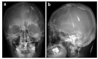 | Figure 2 Anterior-posterior a and lateral b projections of skull x-ray films of a patient (#10) who underwent a simultaneous DBS/ MCS trial for intractable, chronic neuropathic pain. This patient had both thalamic Vc and internal capsule DBS electrodes combined with a left-side MCS electrode. Note the previously implanted C1–C2 paddle lead for treatment-resistant complex regional pain syndrome with whole-body involvement, which was more severe in the right hemibody. In this particular patient, we obtained >50% pain relief with the initial MCS trial. However, thalamic Vc stimulation aggravated the hemibody pain. The prominent analgesic effect of MCS faded postoperatively within six months. However, the patient still today (24 months after MCS) uses chronic MCS for unremitting pain. He judged MCS as being much more effective than spinal cord stimulation. |