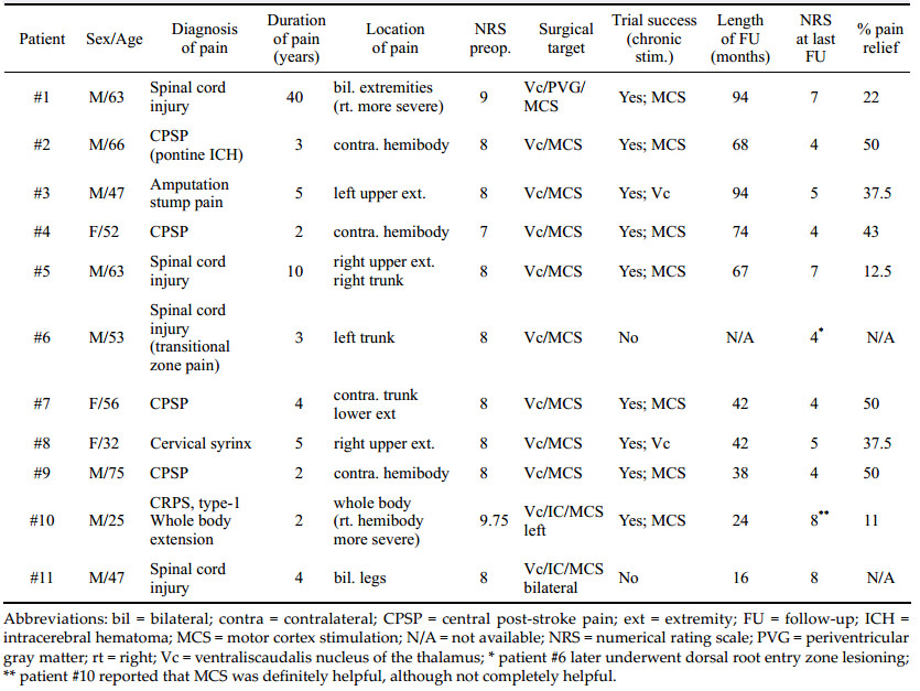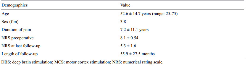 The demographics of the patients included in this trial are summarized in Tables 1, 2 and 3. The mean age of the patients was 52.6 years (range: 25-75; men: women: 8:3), and the mean duration of follow-up was 52.6 ± 14.7 months (range: 24-94 months). The type of pain experienced by the patients included central post-stroke pain (n = 4), spinal cord injury (n = 5), below-level neuropathic pain from C4 cord injury, thoracolumbar shell injury, transitional zone pain, iatrogenic spinal cord transection, central pain of the cervical syrinx, amputation stump pain in the arm, and complex regional pain syndrome type-Ⅰ (CRPS-1) with whole body extension.