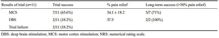3.2 Long-term outcomes and complicationsWith a mean follow-up duration of 56 ± 27.5 months (mean ± standard deviation, n = 9, range: 24-96 months), the mean NRS decreased from 8.1 ± 0.54 to 5.3 ± 1.6 (P < 0.05, paired-t test). The percentage pain relief (PPR) values in the chronic MCS (n = 7) and chronic DBS (n = 2) groups were 34.1% ± 18.2% (mean ± standard deviation, range: 11.1%-50%) and 37.5%, respectively. There was no difference in the degree of pain relief between the MCS and DBS groups (chi-square test, P = 0.807). With more than four years of long-term follow-up, five of the seven patients treated with MCS (71%) and both patients treated with DBS were assessed, with long-term success defined as >30% pain relief compared to baseline.