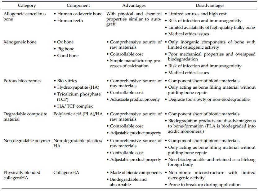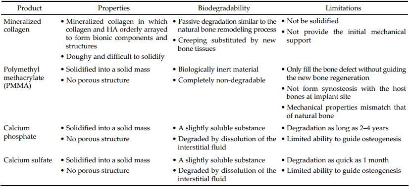 Other than traditional synthetic bone grafts that only act as structural supersedes without any functional bioactivity, the MC is not only biocompatible, biodegradable, and absorbable, but also osteoconductive and osteoinductive. Prostheses made of MC could undergo "creeping substitution", a process of osteogenesis and bone regeneration after implantation. Nonetheless, concerning the short run effect, all prostheses should provide initial protection to the bone defect shortly after implantation. With less mechanical strength than metal materials, MC was considered inferior to metal materials regarding the aspect of providing initial stability before forming coalescent or confluent linkage with surrounding osseous tissues. This blind side of MC needs to be ameliorated by biomedical engineering. A comparison of the abovementioned major bone substitute materials is summarized in Table 1.