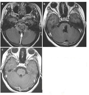 | Figure 3 Case 1: Central pontine cavernous malformation. Axial gradient-echo image (a), enhanced T1-weighted postoperative with 72 hours (b) and enhanced T1-weighted postoperative scans at 3 month (c). White arrow showed the entry point. |