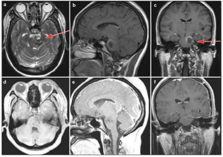 | Figure 5 Case 3: Cavernous malformation in the left pons and lower midbrain. T2-weighted (a), enhanced sagittal T1-weighted (b) and enhanced coronal T1-weighted (c) demonstrated the location of the cavernous malformation. Enhanced axial T1-weighted (d) and sagittal T1-weighted (e) postoperative within 72 hours showed that the lesion was totally resected. Enhanced coronal T1-weighted (f) showed no recurrence after 3 months follow-up. Red arrow showed the entry approach (subtemporal approach). |