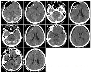 | Figure 2 Computed tomography images obtained after surgery (a, b: 60 hours; c, d: 4 days; e, f: 7 days; g, h: 11 days; i, j: 19 days). |