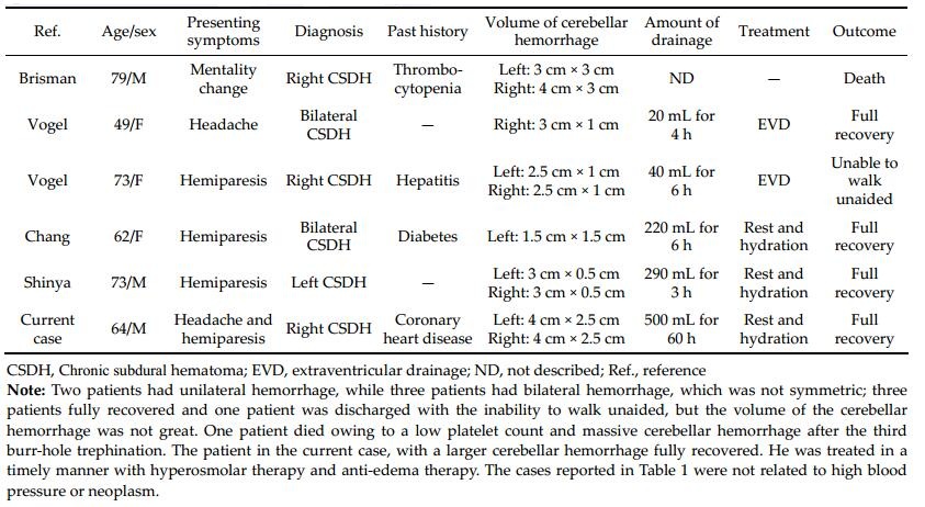 We performed a PubMed search and found five cases of RCH after burr-hole evacuation for CSDH[5–8]. The characteristics of our case and the five other cases are summarized in Table 1.