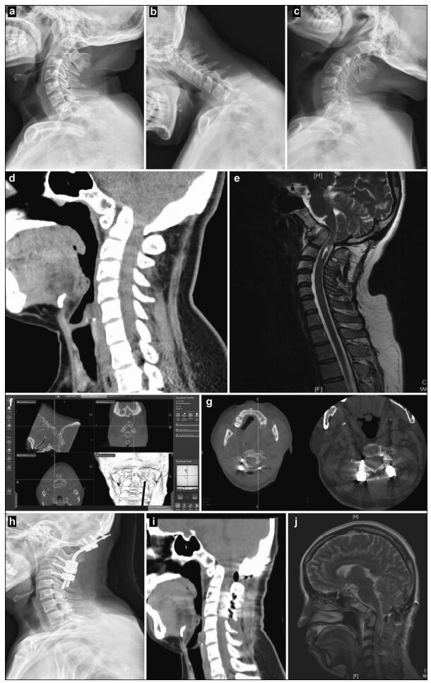 | Figure 1 Preoperative, intraoperative, and postoperative images of patients with atlantoaxial dislocation and occipitocervical fusion. Preoperative cervical radiography in the side (a), anteflexion (b), and supine (c) positions reveals odontoid instability and a backward and upward shift. Preoperative computed tomography (CT) (d) and magnetic resonance imaging (MRI) (e) show that the backward and upward dislocation of the C2 odontoid impacts the brain stem. The foramen magnum is narrow, and the cervical cord void is visible. (f) Implantation direction and C2 angle. Pars screws are planed under intraoperative navigation. (g) O-arm three-dimensional scan, after screw implantation, shows that the Pars screw to the right of C2 penetrates the bone cortex and is near the vertebral artery. Lateral radiography (h), sagittal CT (i), and a T2 sagittal scan (j), 1 week after the operation, show firm screw fixation in a good position and inferoanterior displacement of the odontoid to the C1 level, essentially achieving normal anatomical reduction. Brain stem compression is released, and the posterior cranial fossa is fully decompressed. |
