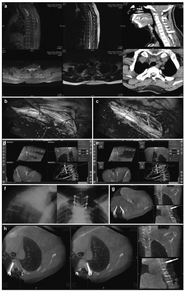 | Figure 2 Preoperative, intraoperative, and postoperative images of patients in the thoracic intraspinal meningioma resection and pedicle screw fixation group. (a) Cervical thoracic vertebrae computed tomography shows a high-density tumor shadow in the thoracic spinal canal (T1-T4). Magnetic resonance imaging shows T2 image isointensity in the spinal canal (T1-T4). An enhanced scan shows a significantly enhanced area located in the ventral spinal cord that has invaded the intervertebral foramen. (b) Intraoperative microscopy shows a spinal cord ventral tumor, originating in the dura mater. (c) Intraoperative microscopy shows nearly total resection of the spinal cord ventral tumor, with the spinal cord remaining intact. (d, e) Intraoperative T2 pedicle screw implantation is performed under real-time navigation. The entry direction, angle, and depth of the screw is according to the navigation plan. (f, g, h) After screw implantation, an O-arm two-dimensional lateral scan shows good screw positioning. The O-arm three-dimensional scan found that the T1 bilateral pedicle screws are well positioned and do not penetrate the bone cortex. The T4 left pedicle screw position is also good. The left pedicle screw is in the lateral vertebrae, and no lung injury is seen between the vertebral body and rib. The screw position was not adjusted intraoperatively because it is within the acceptable range. |