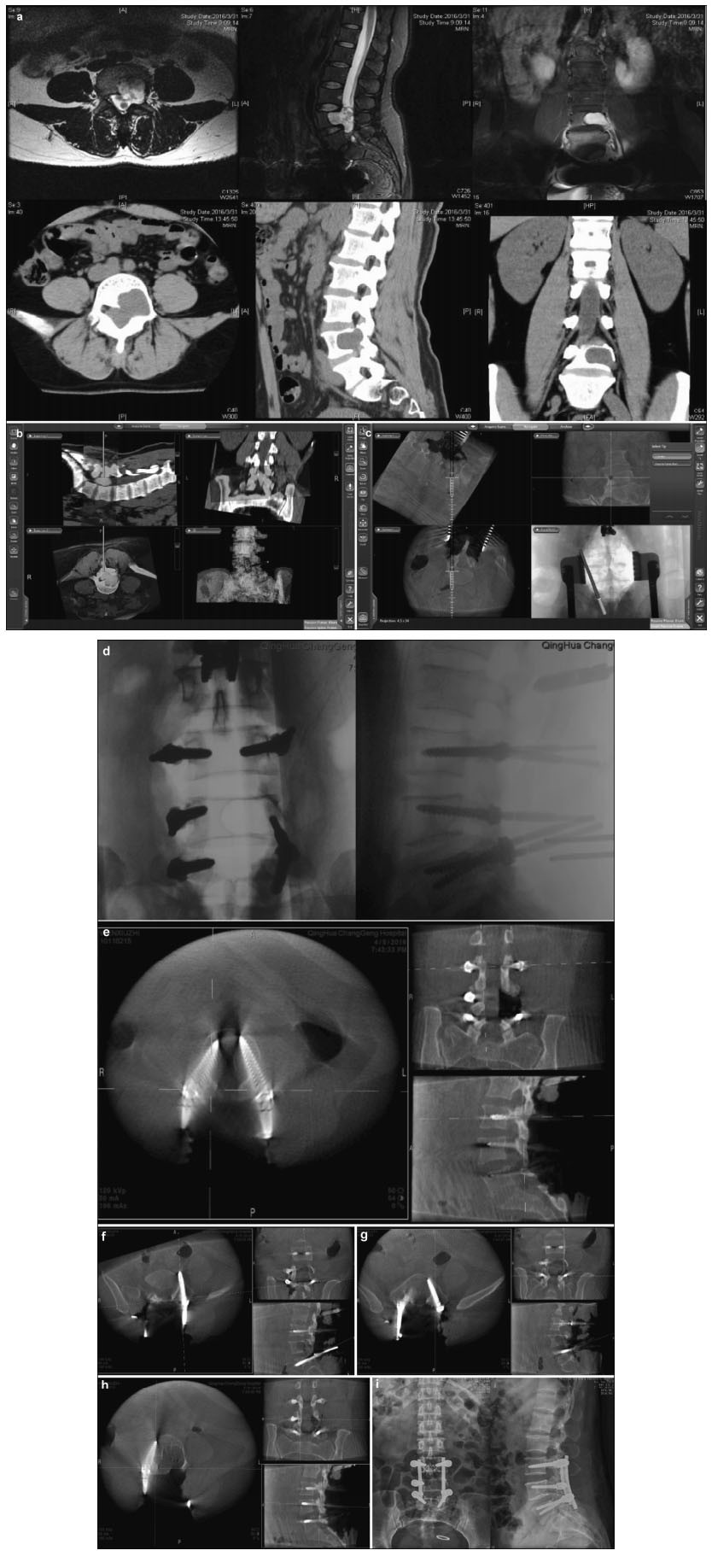 | Figure 3 Preoperative, intraoperative, and postoperative images of the lumbar spinal canal of a patient in the internal and external schwannoma resection and pedicle screw fixation group. (a) Lumbar computed tomography (CT) shows an L4-5 intraspinal isodense tumor and a damaged L4 left pedicle and vertebral body. Magnetic resonance imaging (MRI) shows an iso-and hyperintensive signal tumor at L4-5 on the intraspinal T2 image. It is located on the left side of the spinal canal and has invaded a vertebral body and the intervertebral foramen. (b) Fusion of the CT and MRI images, in combination with an intraoperative O-arm and navigation technique, identifies the tumor site and border. (c) Intraoperative L5 pedicle screw implantation is performed under navigation. The screw's direction, angle, and depth can be seen to match the navigation plan. (d) After screw implantation, an intraoperative O-arm two-dimensional lateral scan shows that the screw position is good. (e) An O-arm three-dimensional (3D) scan shows that the L3 pedicle screw position is good, and does not penetrate the bone cortex. (f) An O-arm 3D scan shows that the L5 left pedicle screw position moves away from the vertebral body and penetrates the rough pedicle bone cortex; (g) An O-arm scan was conducted again to introduce the navigation system as part of the correction of the L5 left pedicle screw, getting it to a good position. (h) An O-arm 3D scan shows that the L4 right pedicle screw position is good. It does not penetrate the bone cortex. Screws are difficult to implant in the left pedicle and vertebral body due to tumor invasion. (i) A lateral lumbar radiography scan, 7 days postoperatively, shows firm screw fixation and good positioning. |