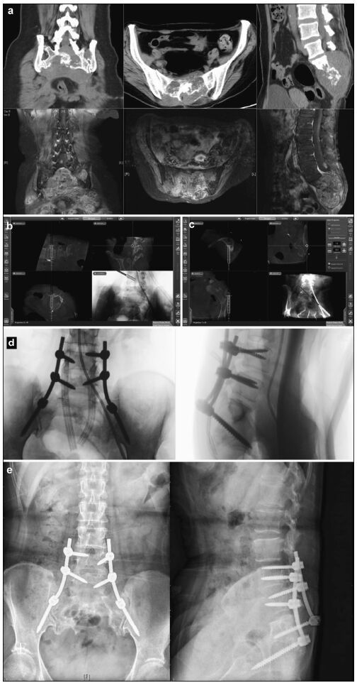 | Figure 4 Preoperative, intraoperative, and postoperative images of patients in the nearly total sacrococcygeal chordoma resection and pedicle screw fixation group. (a) Lumbosacral vertebral computed tomography shows an S1-3 intraspinal isodense tumor and a severely damaged vertebral body. An enhanced magnetic resonance imaging scan shows S1-3 intraspinal internal and external tumors and a vertebral body that has been invaded and damaged. (b) Intraoperative L4 left pedicle screw implantation is performed under navigation. The direction, angle, and depth of the screw entery can be seen to match the navigation plan. (c) Intraoperative right iliac screw implantation is conducted under navigation. The direction, angle, and depth of the screw entering can be seen according to the navigation plan. (d) After screw implantation, an O-arm two-dimensional lateral scan shows good screw positioning. (e) A lateral lumbar radiographic scan, 7 days postoperatively, shows firm pedicle and iliac screw fixation and good positioning. |