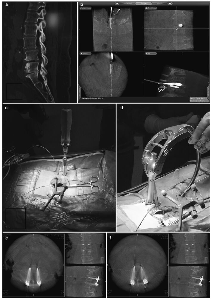 Each patient in the thoracic/lumbar/sacral pedicle internal fixation group was also placed prone. The thoracic/lumbar/sacral posterior structures were revealed through a conventional posteromedial approach, and the navigation reference rack was fixed to the upper vertebral spinous process root of the plant screw. Bilateral pedicle fixation was selected, according to the disease. O-arm scanning produced 2D and 3D anteroposterior and lateral images, which were transmitted to the navigation system workstation. The accuracy of the navigation was verified on the spinous process after the navigation guide bar was registered on the reference rack. The navigator provided many implantation orbits, and the surgeon selected the best one, according to the navigation guide. Screw diameters, lengths, and paths were selected under navigational guidance, and each screw was implanted using real-time navigation. After screw implantation, O-arm anteroposterior and lateral 2D and 3D images were again obtained to evaluate the positioning, direction, and depth of each implant.