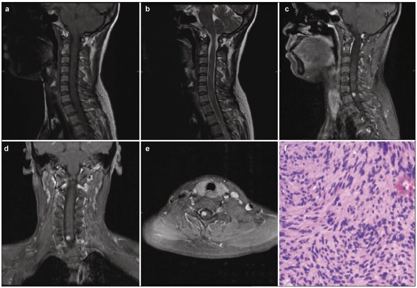 | Figure 1 (a) Sagittal T1-weighted magnetic resonance image demonstrating an isointense lesion. (b) Sagittal T2-weighted magnetic resonance image demonstrating a slightly hyperintense lesion, with swelling surrounding it. (c-e) Sagittal, coronal, and axial T1-weighted magnetic resonance images, with gadolinium contrast, demonstrating homogeneous enhancement of the tumor. The tumor appears as a solid mass, located to the right side of spinal cord, with clear margins. (f) Hematoxylin and eosin staining from the biopsy of the mass showing bipolar spindle cells with nuclei arranged in a palisade pattern (Hematoxylin & Eosin stain; magnification, ×100) |