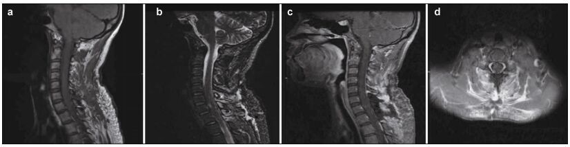 Schwannomas are some of the most common spinal tumors, accounting for nearly 30% of spinal tumors[1].Intramedullary schwannomas comprise approximately 0.3% of all medullary tumors and 1.1% of spinal schwannomas[2, 3]. Schwannomas arise from Schwann cells of the neuronal myelin sheath[1-7]. There are no Schwann cells in intramedullary neural tissues; therefore, the origin of intramedullary schwannomas remains controversial. Few cases of intramedullary schwannomas have been reported since the first case was reported by Penfild et al. in 1932[4]. Intramedullary schwannomas can occur along the length of the spinal cord, including in the cervical, thoracic, or lumbar cords[2]. Magnetic resonance imaging (MRI) is an important method for diagnosing intramedullary schwannomas; however, the misdiagnosis rate remains high[3, 8, 9]. Surgical resection is the most common and effective method for treating intramedullary schwannoms[10]. In the current study, a case of intramedullary schwannoma in the cervical spinal cord is reported, along with its clinical features, radiologic and histopathologic observations, and one-year follow-up MRI results; a literature review of these aspects is also presented.