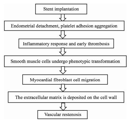 With the continued development of vascular stent technology and materials, current intracranial vascular stents have become an important method of treating intracranial vascular diseases (such as intracranial artery stenosis caused by ischemic stroke)[5]. These systems have become increasingly effective, safe, and widely recognized. Although stent angioplasty reduces the rate of restenosis in postoperative blood vessels, in-stent restenosis (ISR) may still occur in diseased vessels, leading to stroke. This significantly affects the clinical utility of these systems. Studies have shown that the metal stent restenosis rate is as high as 50%[6, 7]. ISR treatment is more difficult than the treatment of simple postoperative (postoperative or perioperative) restenosis and has become a key factor affecting the efficacy of stent implantation[8]. The cause of ISR is different from that of postoperative restenosis, mainly due to the inflammatory response after stent implantation and hyperplasia of smooth muscle cells (SMC) during the self-repair process and migration to the intima (Figure 1).