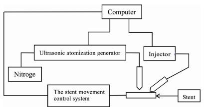 The use of an ultrasonic atomization spray system is outlined in Figure 5. The control panel on the injector can be used to set the flow rate of the spray solution and the spray volume. The computer controls the switch status of the injector. The sprayed liquid is atomized using an ultrasonic atomization generator. The liquid is then sprayed onto the inner and outer surfaces of the stent using computer-aided focusing and the speed and mode of movement of the stent are controlled by a computer. The thickness of the spray coating and the amount of spray applied can be controlled by adjusting the number of spray cycles.